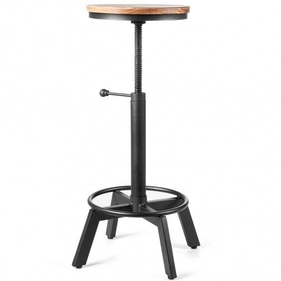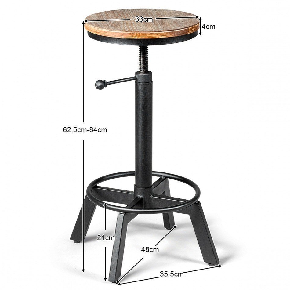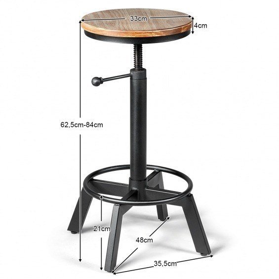 Su aspecto retro garantiza un punto impresionante y atractivo sin importar en restaurantes pubs cafeterías o hogares. Además la construcción de hierro grueso con una superficie resistente al óxido garantiza un asiento seguro y un tiempo de servicio duradero. La altura del asiento se puede ajustar sin esfuerzo de 62 5 cm a 84 cm girando el asiento para acomodar mesas de diferentes alturas. Y el reposapiés ergonómicamente diseñado lo ayudará a reducir la fatiga de las piernas. Asiento de madera de pino para una excelente durabilidad y una cómoda sensación de estar sentado. Atributo: Diseño de altura ajustable - El ajuste de altura libre y flexible con menos esfuerzo se puede lograr a través del asiento de 360 grados que permite que la altura se pueda ajustar de 62 5 cm a 84 cm para adaptarse a sus diferentes posturas. Asiento de madera - Hecho de madera de pino que conserva el grano de madera natural el asiento puede proporcionar una experiencia suprema para sentarse. El asiento lo suficientemente liso también es conveniente para su limpieza diaria y mantenimiento. Construcción robusta del marco de metal - El marco está diseñado en hierro espeso sólido para proporcionar mayor durabilidad y puede soportar un peso máximo de 150 kg. Crea una estructura firme para brindarle un soporte confiable. Mientras tanto 4 pies resistentes pueden mejorar la estabilidad con fuerza.Reposapiés ergonómico - El reposapiés redondeado diseñado ergonómicamente relajará los músculos de sus pies para obtener una comodidad. Además equipado con 4 almohadillas de pie ajustables se mantendrá equilibrado en cualquier terreno irregular si gira las almohadillas de pie según ciertas condiciones. Estilo retro único - Con un aspecto retro industrial único será un punto impresionante como decoración perfecta ya sea que lo organice en un restaurante café pub o en el hogar. Además el revestimiento de la superficie es resistente a la oxidación y al óxido para garantizar una larga vida útil. Características: El marco de hierro grueso proporciona un soporte potente soporta hasta 150kg. La artesanía de soldadura de alta calidad mejora la seguridad de manera efectiva. La altura se puede ajustar de 62 5 cm a 84 cm para adaptarse a su postura. Ajuste la altura del asiento girando 360 grados sin esfuerzo & conveniente. El reposapiés redondo relaja el músculo de la pierna para ofrecer una experiencia de descanso fácil. Estilo industrial y retro es adecuado para cocina pub restaurante etc.