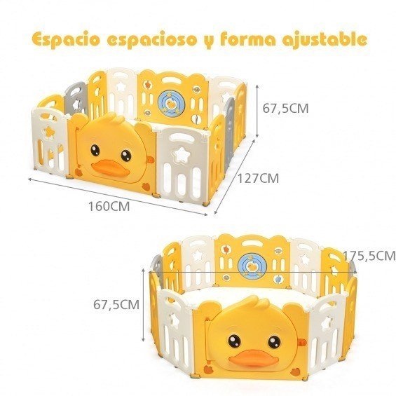 ¿No tienes tiempo para hacer las tareas domésticas no sabiendo donde dejar el niño? Entonces nuestro parque es perfecto para ti. Hecho en HDPE atoxico y sin BPA garantiza la salud del niño. El cierre de seguridad en la puerta y la base antideslizante de silicona aumentan la estabilidad. Regulando las bisagras se pueden crear varias formas que se adaptan a la habitación. El panel con juegos estimula la imaginación del niño pero también las habilidades cognitivas y la motricidad. Se monta fácilmente y se pone también en un rincón de la casa. ¡Cómpralo ya! Atributo: Material atoxico y alta estabilidad: considerando la piel delicada de los niños y la seguridad elegimos HDPE como material atoxico y sin BPA. Las almohadillas antideslizantes y las ventosas en la parte inferior mantienen firmes los paneles. Panel con juegos para liberar las manos de los padres: hay unas pelotas giratorias y unas estrellitas sonoras en el panel que ejercitan las habilidades cognitivas y la motricidad de los niños. De esta manera los padres tendrás tiempo para desarrollar las tareas domesticas o trabajar sabiendo que el niño está a salvo. Diseño plegable fácil de desplazar: para facilitar el montaje el panel con valla es plegable. Sin complicarse en el montaje el parque se desplaza fácilmente a todos lados como dormitorio salón o balcón. Además no ocupa mucho espacio y se puede poner en un rincón. Combinable en varias formas: la parte superior de la valla tiene muchas conexiones para evitar que se deforme durante el uso. Además se puede montar en forma circular rectangular cuadrada y también con formas irregulares. Amplio espacio para jugar: para favorecer el crecimiento del niño proyectamos este parque con diferentes juguetes y estampados. Los niños aprenderán a gatear a caminar y a desarrollar la motricidad en un lugar seguro y espacioso. Características: Panel de 67 cm para evitar que el niño escape HDPE atoxico y duradero para garantizar la seguridad del niño Almohadillas antideslizantes en goma para garantizar la estabilidad del parque Ventosas antideslizantes para mantener fijos los paneles Cierre de seguridad en la puerta para evitar que el niño la abra Juguetes bonitos que llaman la atención del niño Paneles combinables en la forma que se prefiere