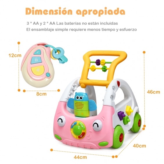 Nuestro andador asegura un proceso de aprendizaje más eficiente en el camino hacia los primeros pasos de sus bebé. No solo alienta a su bebé a caminar gracias a su diseño colorido y efectos de sonido y luz, sino que también le brinda mucha diversión. La construcción estable evita que el andador se vuelque. Control de la deceleración es una función perfecta para proteger a sus niños de las lesiones causadas por accidentes. Tiene un soporte firme para que sus niños pueda jalar fácilmente el carrito. Atributo: Aprende a caminar bien con la guía correcta - En comparación con los andadores convencionales y normales, este andador 3 en 1 ayuda a su hijo a aprender a caminar de manera aún más efectiva. Los niños pequeños pueden empujarlo con ambas piernas delante de ellos para refuerza las piernas. Mango regulable en 3 posiciones - El mango se puede ajustar fácilmente a tres alturas diferentes (33cm, 37cm y 46cm) para poder adaptarse al tamaño y a la edad respectiva. Las esquinas redondeadas y la superficie lisa protegen a su bebé. Las pelotas giratorias de colores brillantes unidas al mango atraen a los niños. Botones inteligentes - Con efectos luminosos, sonoros y musicales, el niño se divertirá muchísimo presionando los botones. Además, tiene un control remoto separado, lo que facilita la control de los sonidos desde la distancia y facilita el control del andador Búho de juguete divertido y flexible - El búho unido a la parte delantera del correpasillos es un complemento perfecto y se puede girar con flexibilidad.Lo que junto con los efectos de iluminación despierta la curiosidad de sus niños.Los bloques removibles aumentan la creatividad del niño. Ruedas antideslizantes con control de retardo - Las 4 ruedas aseguran la estabilidad de la estructura y las tiras antideslizantes evitan deslices garantizando una utilización segura. Además, el control de la deceleración es una función perfecta para los niños que están empezando a caminar evitando caídas provocadas por una velocidad elevada. Características: Sonido multifuncional y efectos de luz. 4 ruedas antideslizantes con control de desaceleración. Ayuda efectiva para que los niños pequeños aprendan a caminar de manera segura y correcta. Asa ajustable en altura, ajustable al tamaño individual del niño Construcción robusta y estable para un empuje fácil y seguro. Materiales ABS y PP no tóxicos para un uso seguro e inofensivo. Certificado según EN71 para la confiabilidad y seguridad de sus niños.