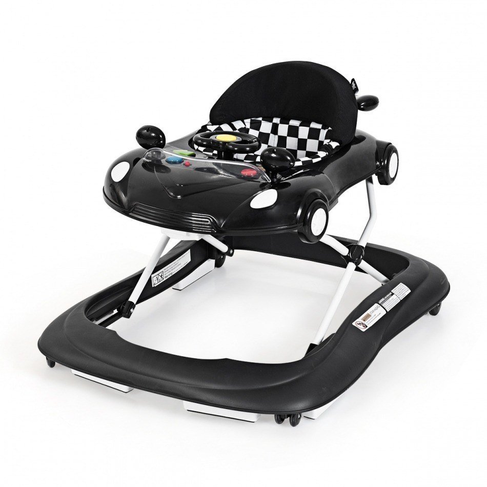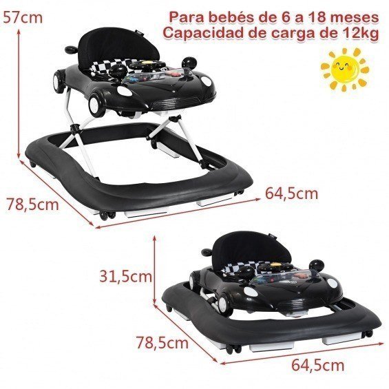 Este andador hace que tu niño aprenda a caminar y a comer, evitando las piernas colgando reforzando los músculos. Hay 2 alturas disponibles para regular según la edad del niño. El volante se puede girar y tiene también la bocina. Presiona en la parte inferior del volante y empezar a sonar una música muy bonita. El volumen se puede controlar para evitar daños en la audición. Los materiales utilizados son muy seguros para proteger la salud de los niños. Atributo: Seguro para los niños: se garantiza la seguridad para los niños. El andador no tiene partes puntiagudas o sustancias dañinas que pueden dañar al niño. Las 2 ruedas amortiguadoras y los 6 dispositivos antivuelco evitan el riesgo de verterse y de ir demasiado rápido en suelos lisos y pendientes. Multiuso: plegable y con la bandeja desmontable, el andador puede ser un lugar en el que ayudar al niño a comer solo. El andador fue hecho con una distancia adecuada para no golpear los talones y los dedos de los pies del niño. Primera experiencia de conducción: gira el volante y empieza a conducir. El andador con forma de coche incluye efectos sonoros que simulan los de un coche real. Hay una caja de música con volumen regulable y las luces también. Es la mejor manera para estimular el desarrollo intelectivo del niño con música y colores. Asiento regulable según la edad: el asiento se regula en 2 alturas según la estatura del niño, evitando los pies colgando. El respaldo es ergonómico, protege la espalda del niño y lo ayuda a mantener una postura correcta. Cojín blando y muy cómodo: acolchado con una esponja de alta calidad y revestido con un tejido analérgico, el cojín tiene una elasticidad alta y una buena transpiración. No se rompe fácilmente y dura en el tiempo. Se puede quitar para limpiarlo fácilmente. Características: Altura regulable según la edad y la estatura del niño Efectos sonoros y volante que gira Volumen regulable para proteger a audición del niño Ruedas amortiguadoras que evitan ir demasiado rápido 6 dispositivos antivuelco para evitar verterse Útil para aprender a caminar y para cuidar al niño Se puede almacenar en espacios estrechos gracias al diseño plegable Fácil de limpiar con el cojín removible