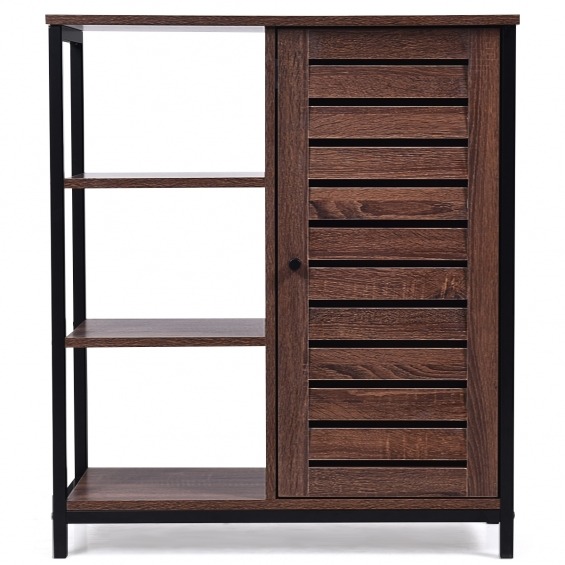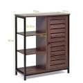 Este mueble de baño con un diseño rústico e industrial combina un aspecto simple con una funcionalidad práctica. Se compone de aglomerado y metal sólido, por lo tanto, tiene una excelente estabilidad y una larga vida útil. Los 3 estantes abiertos y 2 internos le ofrecen mucho espacio de almacenamiento para sus artículos cotidianos. Se puede combinar idealmente con su estilo de decoración individual y es perfecto para baños, salas de estar y dormitorios, así como para todos los pasillos. Atributo: Espacio de almacenamiento personalizable - Este mueble de baño tiene 3 estantes abiertos y 2 estantes interiores, que le ofrecen todo el espacio para almacenar sus artículos. Los estantes interiores son ajustables en altura según sus necesidades individuales ayudan a organizar y a clasificar los objetos. Materiales de alta calidad -Armario de suelo para baño está hecho de aglomerado de primera calidad, lo que garantiza que sea sólidamente estable y tenga una larga vida útil. Los tubos de metal pintados de negro tienen una superficie resistente a la humedad.Con almohadillas de pies, protegen su piso de daños y arañazos. Diseño rústico - Con su superficie lisa y un diseño rústico e industrial, este gabinete le da a su hogar un aspecto retro especial y único. El elegante marco de metal negro con asa,adecuado para varios estilos de decoración. Uso versátil - Este gabinete versátil no solo se puede usar como mueble de baño, sino que también es ideal como mesa de almacenamiento para su sala de estar o pasillo. Se puede integrar fácilmente en su estilo de decoración individual. Fácil instalación - Este práctico gabinete de almacenamiento tiene una superficie lisa y fácil de limpiar y también se puede configurar fácil y rápidamente. Características: Diseño rústico e industrial. 3 estantes abiertos proporcionar amplio espacio de almacenamiento. 2 estantes internos de altura ajustable. Tablero de mesa espacioso y robusto. Superficie lisa, resistente a la humedad y fácil de limpiar. Se puede combinar fácilmente con estilos de decoración individuales.