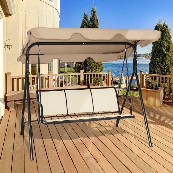 El columpio del jardín es la elección perfecta para quienes sueñan con el descanso y la comodidad en su propio jardín o terraza. Columpio de jardín de 3 plazas está hecho de materiales de alta calidad. El techo está hecho de poliéster de alta calidad. Construcción muy estable. Resistente a las influencias atmosféricas. Relajado sobre las cosas y deje atrás el estrés cotidiano con un buen libro o una copa de vino. Atributo: Techo desmontable - El techo ajustable proporciona una sombra óptima y protege de la luz solar excesiva. También puedes desmontarlo según sea necesario. Características - Pies antideslizantes para mayor seguridad y no rayan el piso. Diseño de 3 plazas, espacio grande con capacidad para 3 personas al mismo tiempo Cómodo - La sistema de suspensión le permite balancear el columpio fácilmente.Te permiten disfrutar del tiempo libre con la familia y los amigos Construcción estable - El cuerpo está hecho de tubo de acero galvanizado con recubrimiento en polvo, resistente, resistente a los arañazos y resistente a los rayos UV. Aplicación multi-escenario - Adecuado para una variedad de ocasiones diferentes, como Jardín , patio, terraza, parque y hotel, para proporcionar espacio para el descanso. Características: Ideal para balcón y terraza. Diseño atemporal y moderno. Techo para una protección solar óptima. Pies y marco hechos de tubo de acero resistente con recubrimiento de polvo. Tres personas: mucho espacio y comodidad para sentarse. Pies de goma antideslizantes para mayor seguridad.