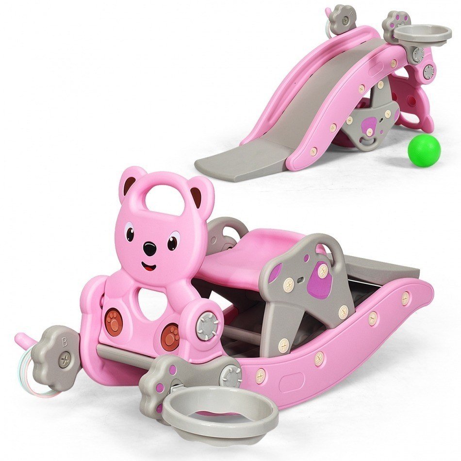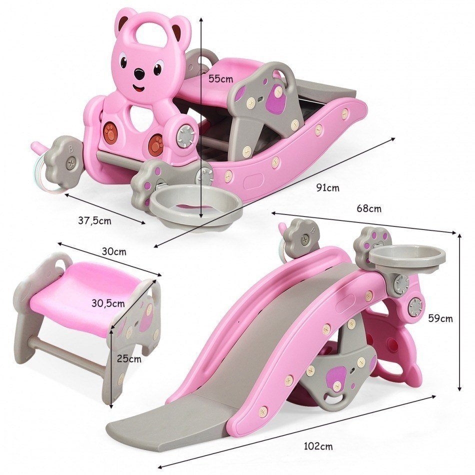¡Este caballo mecedor tiene muchísimas áreas para jugar! Con el tobogán incorporado el niño aumenta el equilibrio mientras desliza. El asiento con el cojín blando es muy cómodo para sentarse. Se incluyen también la canasta con una pelota y un juego con 4 anillos. Hecho en PE de alta calidad el caballo mecedor es sin olores y aguanta hasta 40 kg de peso. Este caballo mecedor es el regalo perfecto para tu niño. Atributo: Caballo mecedor de alta calidad: con un ángulo entre 0 y 38° este caballo mecedor evita verterse y ayuda el niño a desarrollar el equilibrio y el agarre. El asiento blando con cojín blando es removible y es muy cómodo para sentarse. Tobogán liso y resistente: a diferencia de los demás toboganes en el mercado este tiene una zona almohadilla que para los niños en el tobogán aumentando su seguridad. Además las empuñaduras lisas en ambos lados evitan hacerse daño en las manos. Canasta y juego con anillos: con una canasta y una pelota y un juego con 4 anillos este caballo mecedor ejercita las habilidades de tiro de los niños pero también la coordinación de las manos y de los pies. Los juegos se pueden quitar si el niño no los usa. Compañero perfecto para el niño: hecho en PE sin olores este caballo mecedor no daña la salud de los niños y aguanta hasta 40 kg de peso. Es el regalo perfecto para cumpleaños Navidad u otras ocasiones. Fácil de montar: el caballo mecedor se monta fácilmente siguiendo las instrucciones. Además la superficie lisa se limpia muy fácilmente. Características: Aumenta el equilibrio Tobogán liso con excelente protección Desarrolla muchas habilidades con la canasta Desarrolla la coordinación de las manos y de los pies con el juego con anillos Asiento cojín blando muy cómodo y removible Excelente protección con PE sin olores y de alta calidad Ideal para niños de 1 a 5 años y aguanta hasta 40 kg de peso Regalo perfecto para los niños