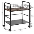 Este carro organizador es ideal para dormitorio cocina casera salón de belleza y oficina. El carro de 2 estantes ideal para almacenar frutas y verduras en la cocina o libros juguetes en casa o documentos en la oficina. El carro con cajones proporciona suficiente espacio. Gracias a las 4 ruedas del carro que facilitan el movimiento con comodidad lo que nos permite colocarlo en cada esquina. Atributo: Estructura resistente y duradera: nuestro carrito está hecho en MDF con una estructura de metal duradero y resistente difícil de deformar y de oxidar. Todos los tubos de metal y las capas son bien firmes para garantizar la capacidad de peso. Amplio espacio: el carrito es cómodo para poner todos tus artículos en un solo lugar. Con 2 repisas espaciosas se pueden colocar materiales de oficina productos de cocina artículos para el aseo personal y tener la casa o la oficina limpias y ordenadas. La protección en la parte superior evita la caída de los objetos cuando el carrito está en movimiento. Diseño de empuje flexible: nuestro carrito tiene 4 ruedas universales de las que 2 con freno. Es ligero y flexible y se desplaza en cocina dormitorio y salón. Las ruedas se bloquean para fijarlo en un lugar. Multiuso y compacto: ligero y compacto el carrito es perfecto para pequeños espacios. Las empuñaduras en ambos lados son cómodas para empujarlo o tirarlo fácilmente. Es impermeable y antióxido y se puede utilizar en cocina baño y salón. Montaje y tamaño: con los accesorios completos y las instrucciones detalladas el carrito se monta en poco tiempo. Tamaño producto: 55 x 40 x 66 cm altura entre los niveles: 32 cm. Características: Estructura estable de metal y tablas de MDF de alta calidad para garantizar estabilidad y duración 2 repisas espaciosas Compacto y ligero salva espacio y fácil de desplazar Combinación de tablas de madera y tubos de metal que crean un estilo industrial y a la moda Nivel superior con protección para evitar la caída de los objetos Ruedas con freno y fáciles desplazamientos Ideal para cocina salón dormitorio oficina baño Montaje simple