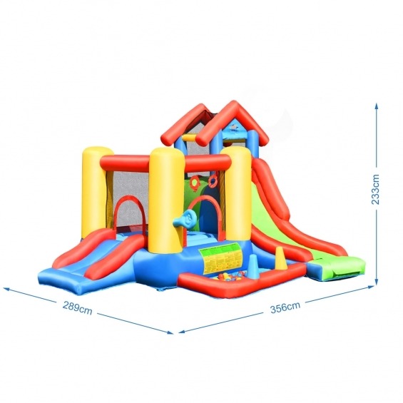 Esta casita inflable es perfecta para que tus niños se diviertan. Pueden saltar, escalar y deslizar en diferentes áreas de juego. Se infla en pocos minutos y se fija al suelo con los palos. La seguridad es desde siempre nuestra prioridad en todos nuestros productos, incluso en esta casita. Hecha en tejido Oxford de alta calidad con una red de protección, la casita inflable es duradera y muy segura para los niños. El bolso de transporte es perfecto para transportar la casita al exterior. Atributo: Grande área para saltar y divertirse: el castillo inflable tiene una grande área para que los niños salten y puedan interesarse a los deportes evitando que se jueguen todo el día con los videojuegos. Se puede poner en el jardín, en el garaje o en la habitación de los niños y llamará su atención haciéndolos divertir muchísimo. Diferentes áreas para divertirse: la casa inflable tiene una piscina con pelotas, un tobogán amplio y una pared para escalar para que los niños se diviertas en diferentes maneras. Estas áreas están divididas para que jueguen muchos niños a la vez. Tejido Oxford duradero y red: hecha en tejido Oxford de alta calidad, la casa inflable es duradera y acompaña los niños en su crecimiento. Incluye también un kit de reparación. Además, para garantizar la seguridad de los niños, hay una red de protección que asegura también una buena ventilación. Fácil de inflar y de almacenar: la casita se infla con un compresor y se desinfla en poco tiempo. Hay 4 palos para fijarla al suelo y para garantizar la estabilidad. Además, la bolsa de transporte es perfecta para poner y transportar la casita una vez desinflada. Regalo perfecto para niños: hecha para garantizar la comodidad y la seguridad, la casa inflable es el regalo perfecto para los niños. La superficie lisa sin partes puntiagudas evita que los niños se hagan daño. Los niños se divertirán muchísimo con esta casita inflable. Características: Grande área para saltar, tobogán amplio, pared para escalar y piscina con pelotas para divertirse Tejido Oxford de alta calidad con revestimiento en PVC, impermeable y resistente a los rayos ultravioletas Red de protección para los niños y buena ventilación Diseño bonito con colores brillantes Inflado y desinflamiento rápidos en pocos minutos Palos para asegurar la estabilidad de la estructura Bolso de transporte para transportar y almacenar fácilmente la casita Regalo perfecto para niños y diversión garantizada Ideal para ambientes internos o externos como jardín, patio, habitación de los niños