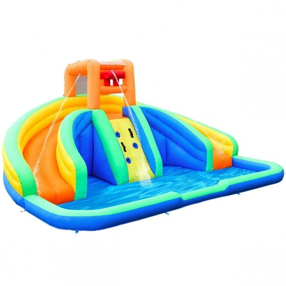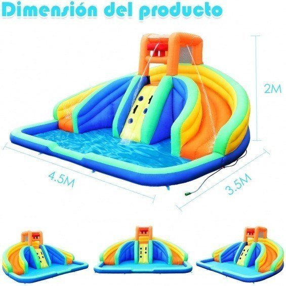 Este parque acuático inflable es bonito y de alta calidad. Incluye 2 toboganes de agua una pared para escalar y una piscina para que los niños se diviertan y promuevan su crecimiento. El tejido Oxford de alta calidad es muy resistente y dura en el tiempo. La estructura estable y el diseño seguro hacen que los niños jueguen sin preocuparse. Se infla y se desinfla fácilmente (kit de reparación y palos incluidos). Atributo: Áreas múltiples para jugar: con 2 toboganes de agua una pared para escalar una piscina y una casa inflable tus nonos podrán divertirse todo el día. De esta manera jugarán en formas diferentes y desarrollarán varias habilidades muy importantes para su crecimiento. Parque acuático amplio: este parque acuático inflable mide 4 5 x 3 x 2 m y pueden jugar más niños a la vez para divertirse aún más. Pueden jugar en la piscina con las pelotas o deslizar uno a la vez en el tobogán. Material resistente al desgaste: hecho en tejido Oxford con una resistencia al desgaste nuestro parque acuático es perfecto para divertirse en verano sin preocuparse si se destiñe se corroe o se daña porque es duradero. Es perfecto para poner en ambientes internos y externos. Red de seguridad adicional: están las empuñaduras fáciles de agarrar en ambos lados de la pared para que el niño escale en toda seguridad. La parte superior está rodeada por una red transpirable y por empuñaduras adicionales para proteger el niño mientras salta y evitar deslizar. Fácil de inflar y de almacenar: la piscina tiene válvulas para drenar rápidamente el agua. Además el parque acuático se infla y se desinfla en pocos minutos con un compresor de 750 W (no incluido). Después del uso se pliega y se pone en la bolsa de transporte para almacenarlo. Características: 2 toboganes de agua una pared para escalar y una piscina Tejido Oxford impermeable y antideslizante Red protectora y empuñaduras fáciles de agarrar para garantizar la seguridad de los niños Centro actividad perfecto para refrescarse en verano Fácil de almacenar con la bolsa de transporte incluida Varias áreas para jugar y divertirse Estructura estable y duradera con palos adicionales Fácil de inflar y desinflar compresor no incluido