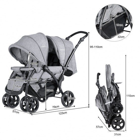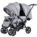 Este carro de bebé diseña para la familia que tiene dos niños. Cada asiento carga 15 kg, es adecuado para los niños menores de 36 meses. Las ruedas delanteras son giratorias, también se puede fijar en dirección. Con los frenos, para rápida y fácil. El mango del carrito es regulable para convenir a los adultos. La silla de paseo es estable gracias a la construcción resistente y las ruedas de reducción de choque. El cinturón de seguridad de cinco puntos protege a sus bebés. Atributo: Diseño estable - Las ruedas delanteras son estables, a causa del diseño de reducción de choque, el cochesito no se sacude cuando se mueve. Protege los cuerpos de los bebés. Cinturón de seguridad - El cinturón de seguridad de cinco puntos proporciona alta protección a los niños para evitar accidentes. Al mismo tiempo, debido a que a los niños gusta jugar, el cinturón de seguridad evita correr a los niños. Altura de mango ajustable - La altura de mango se puede ajustar para convenir a los adultos. Con frenos - Las ruedas traseras con frenos, si quiere para, se detiene rápido. Las ruedas delanteras son giratorias de 360 grados, también se puede fijar en dirección. Asiento regulable - El asiento trasero puede ser plano y el bebé se acuesta dentro. Cada asiento carga máxima 15 kg. Característica: Ruedas de reducción de choque, construcción resistente. La silla es estable. Cinturón de seguridad de cinco puntos, protege a sus bebés. Asiento trasero puede ser plano, el bebé se acuesta adentro. Ruedas delanteras giratorias, también se puede fijar en dirección. Ruedas traseras con frenos, para fácilmente. Mango ajustable en altura.