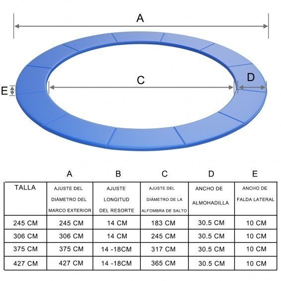 Los muelles expuestos en la cama elástica representan siempre un peligro. Por eso se necesitan las almohadillas protectoras para garantizar la seguridad de los niños y de toda la familia. ¡Nuestra cubierta de protección para la cama elástica es todo lo que necesitas! Hecha con materiales de alta calidad no se deforma fácilmente y garantiza una excelente experiencia de uso. La superficie impermeable se adapta a las condiciones climáticas cubre los muelles y reduce varios riesgos. ¡Cómprala ya!     Atributo: Excelente protección y salto: las almohadillas de la cama elástica cubren los muelles y amortiguan los golpes para garantizar la seguridad de los usuarios y otorgar una excelente experiencia de uso. Nuestra cama elástica hace que los niños y sus familias se diviertan muchísimo. Material duradero y de alta calidad: para aumentar la duración de uso de la cama elástica seleccionamos materiales duraderos y de alta calidad que no se deforman fácilmente ni siquiera si sometidos a grandes fuerzas externas. Excelente resistencia a la intemperie: el tiempo atmosférico es variable pero nuestra cubierta para la cama elástica es impermeable y se adapta a todas las condiciones climáticas. Además las almohadillas cubren los muelles y protegen de la lluvia y del mal tiempo. Plegable y compacta: nuestra cubierta de protección para cama elástica es plegable y ocupa poco espacio. Es también compacta y ligera para almacenarla en un rincón y llevarla a destinación. Fácil de montar y sustituir: la cubierta de protección para cama elástica es plegable y se sustituye fácilmente extendiéndola y fijándola con las cuerdas ahorrando tiempo y energía.     Características: Tamaño perfecto para cubrir los muelles de la cama elástica Otorga una excelente protección para los niños y una buena experiencia de uso Materiales de alta calidad para extender la duración de uso Bandas elásticas fáciles de sustituir Superficie impermeable fácil de limpiar Plegable y compacta fácil de transportar y almacenar Excelente resistencia a la intemperie ideal para uso externo