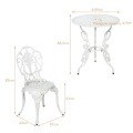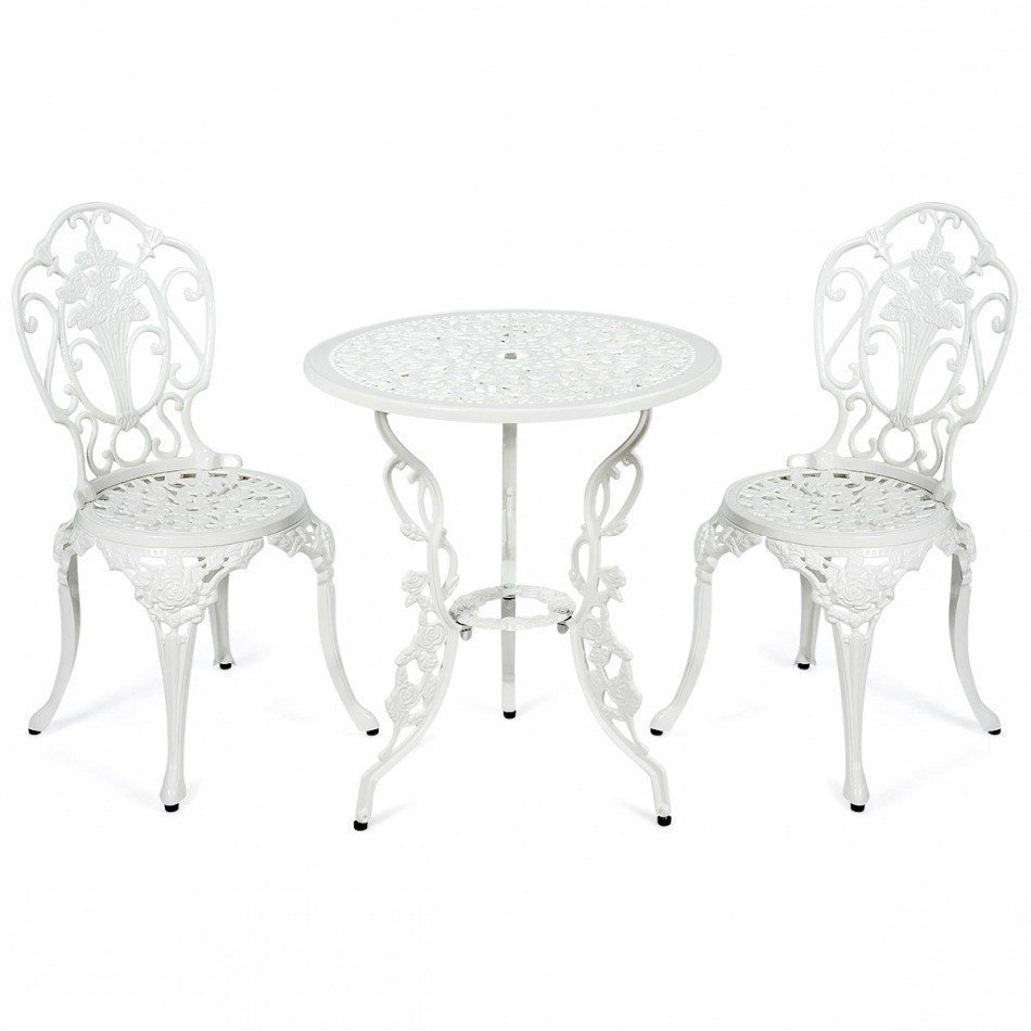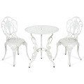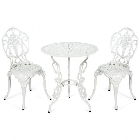 ¿Estás buscando un equipo de exterior para pasar el tiempo libre con amigos y familiares? ¡Nuestro equipo con 3 piezas es la elección ideal! La mesa y las sillas están hechas en fundición de aluminio resistente y duradera. La superficie antióxido extiende la duración de uso. Hay también un hoyo para sombrilla en el centro de la mesa para protegerte de sol y lluvia. Además las almohadillas regulables de la mesa y de las sillas garantizan la estabilidad incluso en terrenos irregulares. ¡Con un adorno de rosas este equipo es perfecto para decorar veranda jardín patio y mucho más! Atributo: Estructura en fusión de aluminio resistente a la intemperie: hecho en fundición de aluminio nuestro equipo de 3 piezas es resistente y duradero. El revestimiento antióxido y resistente a la intemperie lo hace perfecto para uso externo. Además las almohadillas regulables garantizan la estabilidad de la mesa y de las sillas y evitan rayar el suelo. Sillas cómodas y ergonómicas: este equipo es perfecto para charlar en el exterior. Las sillas tienen un respaldo curvo y el asiento ergonómico que alivian el cansancio. Además la estructura de cada silla aguanta hasta 135 kg para que te sientas en toda seguridad. Practico hoyo para sombrilla: hay un hoyo con diámetro de 5 cm en el centro de la mesa para poner la sombrilla (no incluida) para protegerte de sol y lluvia. Es la elección ideal para protegerte a ti a tus amigos y a tu familia en ambientes externos. Diseño con decoración floreal: el adorno delicado con rosas y los clásicos acabados blancos decoran la mesa y las sillas y crean un estilo elegante y a la moda. Este equipo es perfecto para ambientes externos como patio veranda piscina jardín etc. Fácil de montar y limpiar: con las instrucciones claras y todas las herramientas incluidas este equipo se monta fácilmente y en poco tiempo. El diseño hueco es más simple de limpiar ya que el agua corre rápidamente. Gracias a la superficie lisa las manchas se quitan fácilmente con un trapo húmedo. Características: Hecho en fundición de aluminio resistente y duradero Ideal para uso externo con superficie resistente a la intemperie Con almohadillas regulables para mayor estabilidad Sillas ergonómicas transpirables y cómodas para sentarse Hoyo para sombrilla en el centro de la mesa Con adorno de rosas elegante y moderno Utilizable para jardín patio etc. Fácil de montar con las instrucciones detalladas