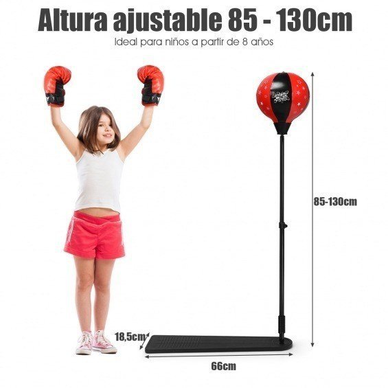 Nuestra pelota de boxeo con base ayuda a desarrollar las habilidades sociales y la coordinación mano ojo. Además, hace que los niños sean felices y hace que cojan seguridad al golpear la pelota. El aspecto bonito y a la moda llamará enseguida la atención de los niños. La altura se puede reglar entre 85 y 130 cm según la estatura y la edad de los niños. ¡Es fácil de utilizar y es un regalo perfecto para los niños! Atributo: Desarrolla las habilidades de boxeo de los niños: esta pelota de boxeo mejora la coordinación mano ojo de los niños, aumenta su fuerza física y refuerza la confianza en sí mismos. Además, es un instrumento muy útil para ensenarles a los niños a boxear. Altura regulable entre 85 y 130 cm: esta pelota de boxeo se puede regular entre 85 y 130 cm según la edad y la altura de los niños. Los acompaña en el crecimiento y crea machismos recuerdos bonitos de la infancia. Es el mejor regalo para niños que aumenta la interacción entre padres e hijos. Base antideslizante para la seguridad de los niños: la base antideslizante aumenta la duración y la seguridad de los niños. No hay que llenarla con agua o arena ya que mantiene la estabilidad con el peso del niño. Además, es compacta y fácil de almacenar sin ocupar mucho espacio. Material duradero: hecho en PE, piel PVC y hierro, este equipo de boxeo protege de la humedad, es anticolisión y antióxido. Si se ensucia, puedes utilizar un trapo mojado para limpiarlo. Además, tiene un muelle sólido y duradero en la base que permite a la pelota volver a la posición inicial después de cada golpe. Diversión para los niños y excelente regalo para las vacaciones: tu niño y tú os divertiréis muchísimo con esta pelota de boxeo. Es un excelente regalo para niños especialmente para las vacaciones o para eventos en lo que se tiene que hacer un regalo. Características: Desarrolla la coordinación mano ojo, los mantiene sanos y refuerza la confianza en uno mismo Base regulable en altura según la estatura de los niños PE de alta calidad y revestimiento en PVC blando para evitar que los niños se hagan daño Base antideslizante muy estable con el peso del niño Rojo y negro con estrellas para llamar la atención de los niños Fácil de montar y limpiar, ahorrándote tiempo y esfuerzos Incluye una bomba manual y un par de guantes