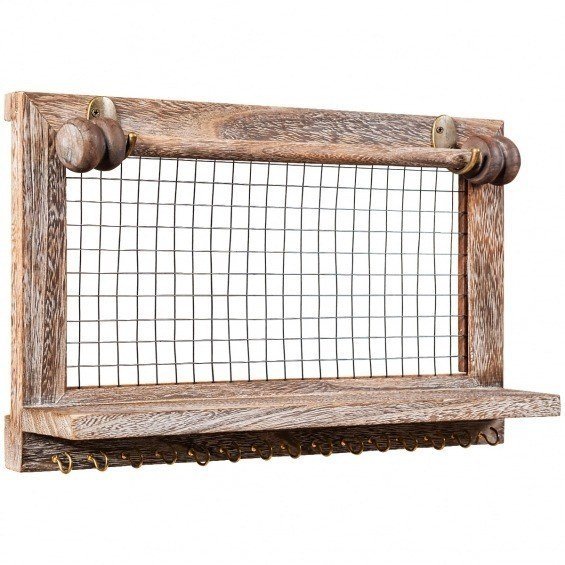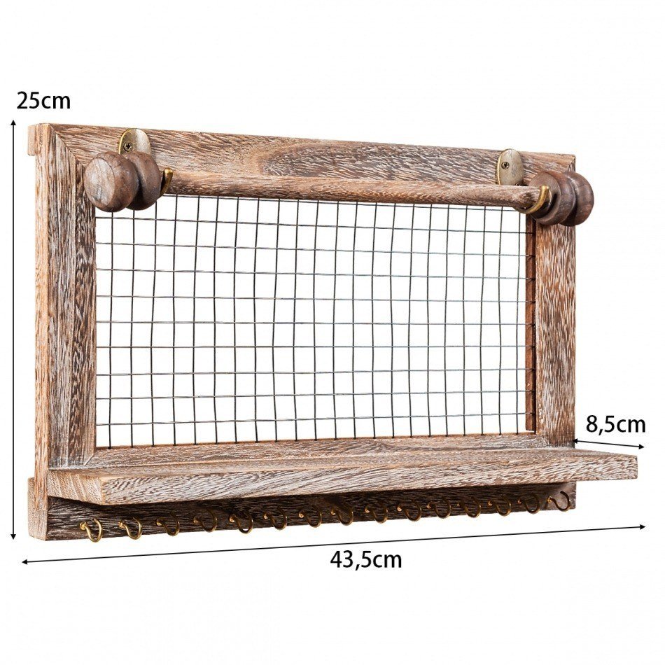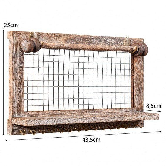 Nunca más pendientes que faltan y collares enredados nunca más años para prepararse revolviendo entre los cajones. Con este armario para joyas tus joyas estarán a salvo y añadirás un toque más a la habitación. Nuestro armario rústico te ayuda a organizar todos tus accesorios y a tenerlos a nao incluso cuando tienes prisa. Atributo: Ahorra tiempo y evita enredos: los 15 ganchos de metal cromado son perfectos para collares y anillos evitando que se enreden y se dañen. Hay también 1 barra de madera removible y una repisa para poner accesorios pulseras esmaltes aceites esenciales y perfumes. Estructura resistente de madera: la madera de Paulonia es la más resistente entre todas y dura en el tiempo. De esta manera puedes poner todas tus joyas en un solo lugar sabiendo que estarán a salvo no oscilarán y no se caerán. Estilo rústico: hecho de madera dura de alta calidad el armario añade un toque rústico a la habitación. El color natural combina con las joyas y es bonito para ver cerca del tocador o del armario. Tamaño compacto montado a la pared: midiendo 43 5 x 25 cm y con un ancho de 8 5 cm el armario combina con salón dormitorio o entrada. practico y a la moda es el regalo perfecto para tu mujer novia hermana hija o amiga. Fácil de montar y limpiar: el armario no necesita ni montaje ni utilizar herramientas. Se puede montar fácilmente a la pared y se limpia con un trapo seco. El diseño rústico no pasará nunca de moda incluso después de haberlo usado muchos años. Características: Organiza las joyas y evita enredos 15 ganchos de metal cromado en L para collares y anillos Barra de madera removible para pulseras joyas anillos Repisa estable para poner esmaltes pendiente dormilona y perfumes Ganchos de metal cromado y estructura de madera duraderos Red de metal perfecta para varios pendientes y con mucho espacio Tornillos y anclajes para montarlo fácilmente a la pared Regalo perfecto para mujer novia hermana hija amiga