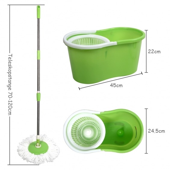 Esta mopa especialmente diseñada puede rotar 360 grados. Por eso es ideal para las puertas, cocinas, baños, lobby, automóviles, dormitorios y casi todas las situaciones. Tiene fibra extrafina con una gran capacidad de absorción. Como resultado, puede eliminar rápidamente la contaminación por completo y no dañar el suelo al limpiar. Atributo: Cabezales de mopa - El exclusivo cabezal de microfibra fácilmente friegue el piso y quite manchas.Y con 2 cabezas de trapeador reemplazables para una mayor vida útil. Resultados de limpieza -Tiene fibra extrafina con una gran capacidad de absorción. Como resultado, puede eliminar rápidamente la contaminación por completo y no dañar el suelo al limpiar. Eliminación de agua - Coloque la fregona y presione hacia abajo, que girará.Se utiliza para eliminar el exceso de agua de la fregona. Humedad absorbente - No hay daños en el suelo; La mopa absorbe la humedad para que su laminado no se doble. Sin esfuerzo - Palanca de la fregona altura ajustable,cómoda limpieza sin agacharse o las manos en agua sucia Características: 2 puntas intercambiables Sistema de rotación doble - 360 ° Puntas hechas de una microfibra. La cabeza de la fregona se puede lavar en la lavadora.