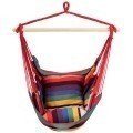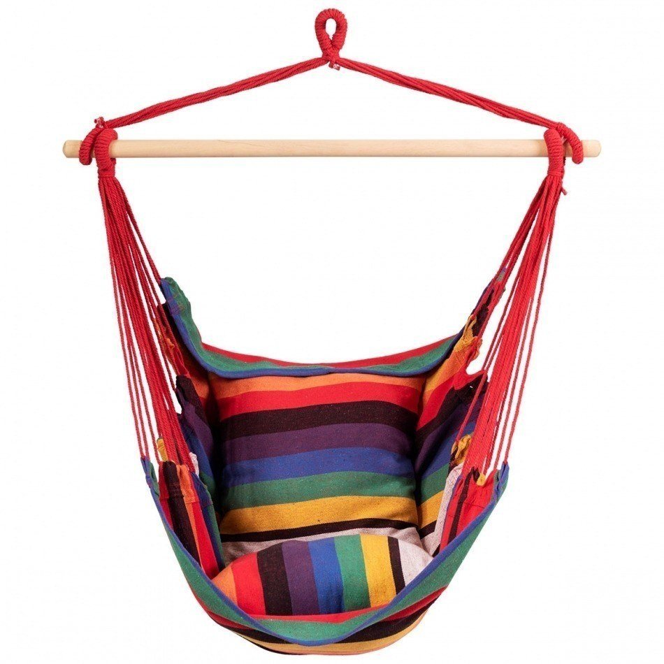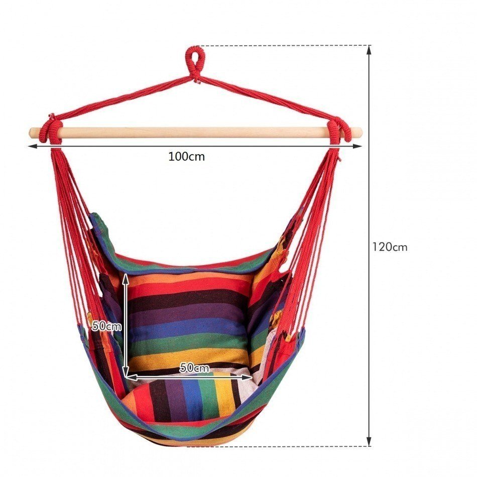 ¿Quieres relajarte por completo? Entonces nuestra hamaca es perfecta para ti. Se monta fácilmente y es perfecta para sentarte o acostarte en ambientes internos y externos como casa jardín y veranda. Tiene un soporte para la espalda y 2 almohadas. Está hecha en algodón resistente que se puede lavar en la lavadora. Se puede colgar en todos lados y aguanta hasta 120 kg. Es perfecta para relajarte en el tiempo libre. Atributo: Resistente y duradera: esta hamaca está hecha en algodón de alta calidad y cuerdas solidas y resistentes al desgaste y puede aguantar hasta 120 kg. La silla-hamaca es ideal para adultos y para niños. Es cómoda y duradera para sentarse y relajarse. Soporte para la espalda y almohadas cómodas: nuestra hamaca está tejida en algodón blando coloreado que no se destiñe y que te envolverá por completo cuando te sientas. Con el soporte para la espalda y las almohadas te sentarás o te acostarás cómodamente para relajarte por completo. Apta para cada ambiente: la hamaca se puede colocar en diferentes ambientes como árboles patios verandas y hasta en los rincones de la casa. Se pude colgar en todos lados y se convertirá en tu refugio favorito para sentarte y relajarte completamente. Fácil de montar y de transportar: solo hay que elegir la posición ideal encontrar un lugar seguro poner el gancho y después los anillos al soporte y a continuación colgar la hamaca. La hamaca es ligera y portátil fácil de transportar a todos lados y de almacenar. Momento de relajación: si quieres leer un libro mirar una película o tomar el sol con en verano escuchar música en la habitación en los días de lluvia o mirar las estrellas por la noche la hamaca es perfecta porque te relajarás por completo y compartirás momentos especiales con amigos y familiares. Características: Algodón de calidad y cuerdas solidas resistentes al desgaste Resistente y duradera que aguanta hasta 120 kg Soporte para la espalda y 2 almohadas Te puedes sentar y acostar para relajarte completamente Ligera y fácil de transportar Fácil de utilizar perfecta de interior y exterior Perfecta para dormir divertirse relajarse Perfecta para jardín patio veranda dormitorio y rincones de la casa