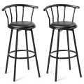 Juego de 2 sillas de bar está hecha de aglomerado y tubos de acero de alta calidad. Cada silla también está equipada con un grueso cojín de espuma y un respaldo redondo, para que pueda relajarse por completo. El reposapiés en la parte inferior le ofrece un lugar cómodo para descansar los pies. Asiento se puede girar 360 grados, puede usarlo según sus necesidades. Taburetes de bar son adecuados para uso en interiores y exteriores. Puede usar el taburete en cocinas abiertas, restaurantes, pubs, cafeterías, terrazas, jardines.   Atributo: Estructura estable y duradera - Silla de bar está hecha de tubo de acero con recubrimiento de polvo y aglomerado de alta calidad . Cuatro pies fuertes aseguran una alta capacidad de carga. Materiales de alta calidad y excelente artesanía garantizan una larga vida útil. Apariencia moderna y elegante - El respaldo curvo y el asiento redondo hacen que la silla de bar se vea elegante. El diseño del respaldo de la silla está de moda y se adapta a cualquier estilo de habitación. Detalles exquisitos - El respaldo adicional de la silla se adapta a la columna vertebral del cuerpo humano y protege su cuerpo. El reposapiés redondo proporciona un lugar de descanso para sus pies. La parte inferior del taburete de la barra está equipada con protectores de plástico que proporcionan un soporte antideslizante y evitan que raye el piso. Asiento giratorio de 360 grados - Ofrecemos estos 2 taburetes con cómodo acolchado de espuma y asiento giratorio de 360 grados de excelente calidad para su comodidad. Crea un ambiente relajado en casa o bar. Amplia gama de aplicaciones - Taburete alto combina un estilo moderno y clásico. Puede usar el taburete en cualquier lugar como asiento o decoración. Ya sea por dentro o por fuera, corta una figura fina en todas partes y es adecuado para restaurantes, pubs, cafeterías, terrazas, cocinas familiares u otros lugares.   Características: Estructura de acero resistente y duradera para una gran capacidad de carga. Un reposapiés redondo para sus pies, para apoyar y relajarse. Cojín de espuma gruesa le ofrecen comodidad a largo plazo El diseño giratorio de 360 grados le brinda libertad de movimiento Los protectores de plástico evitan arañazos en el piso y aseguran el soporte