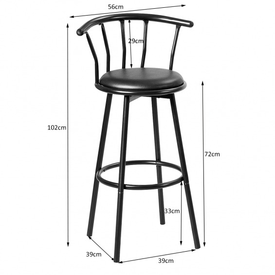 Color: Negro Material: Acero, Aglomerado, Espuma Tamaño único: 55 x 56 x 102 cm Peso del paquete:aprox. 12,8kg (2 sillas ) Capacidad de peso: 130 kg   El paquete incluye: 2 x taburetes de bar 1 x instrucción   Advertencia: No deje las sillas bajo la lluvia o al sol por largos períodos de tiempo.