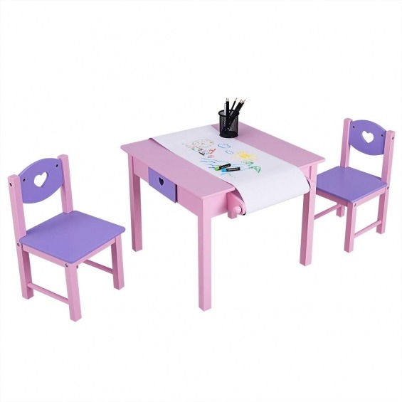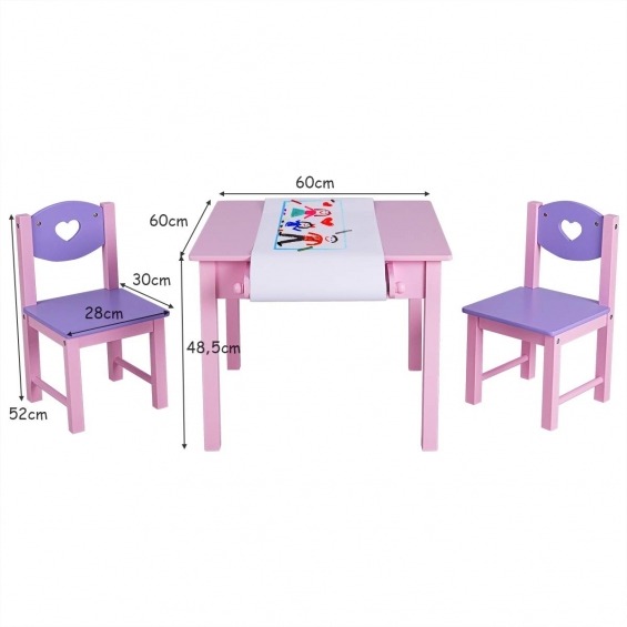 El juego de muebles para niños incluye mesa y 2 sillas para uso diario. Muebles infantiles hecho de MDF y madera de pino, Saludable y duradero. Las pies de la mesa y las sillas están reforzadas. Los niños pueden jugar, aprender, pintar y comer. Los colores coloridos y los estilos únicos permiten que los niños aprendan y se diviertan. Atributo: Bordes redondeados - Los bordes de los muebles para los niños son redondeados para reduce el daño causado por el impacto. Los muebles no tienen puntos afilados,haga que los niños sean más seguros. Material de alta calidad - Juegos de mesa y sillas son están hecho de MDF y los pies de muebles está hecho de madara de pino.Es seguro, saludable y duradero. Larga vida garantizada. Versátil Aplicable - Conjunto muebles para niños se puede usar no solo como mesa de estudio sino también como mesa de comedor y mesa de juego. Puede usar la mesa para niños en la sala de estar, guardería, jardín de infantes e incluso en el jardín. Tornillos con protección contra rayones - Los tornillos están finamente procesados, no se oxidan y no se rayan. Gracias al revestimiento de laca, la superficie es lisa y fácil de limpiar. Con espacio de almacenamiento - Con 2 cajones adicionales tiene espacio de almacenamiento. Hay rollo en el lateral, se puede utilizar para poner papel, fácil de dibujar.El grupo de mesa para niños también es ideal para usar como mesa de comedor. Características: El conjunto incluye 1 mesa y 2 sillas. Estable y la altura es óptima para el niño. Ligero, los niños pueden moverlos fácilmente Rollo de papel práctico Tornillos con protección contra rayones. Respetuoso con el medio ambiente e inodoro.