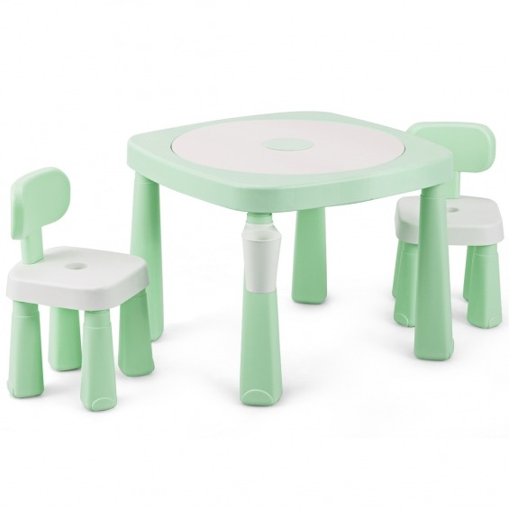 Color: Verde Material: PP Tamaño de la mesa: 64,5 x 64,5 x 50,5 cm Tamaño de la silla: 26,8 x 28,3 x 46,8 cm Carga de la silla: 50kg Edad recomendada: 3-8 años Peso del paquete: 9,9 kg   El paquete incluye: 1 x mesa 2 x silla 24 x bloques de construcción 4 x papeles de pintura AR 1 x manual