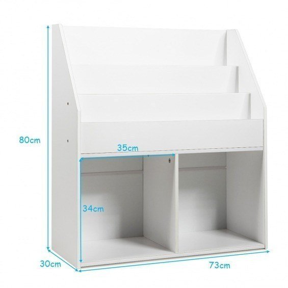 Organiza los libros y los juguetes en nuestra librería. Librería moderna añade funcionalidad a todas las habitaciones de la casa. Hecha en aglomerado es estable y duradera. Con 3 estantes y 2 compartimientos cuadrados en la parte inferior puedes poner libros y otros artículos para que la habitación resulte mas limpia. Se puede poner en el baño en el salón en la habitación y en el pasillo gracias al aspecto blanco y elegante. Atributo: Mucho espacio de almacenamiento - La librería con 3 estantes y 2 divisiones en la parte inferior esta librería tiene muchísimo espacio. Puedes poner diferentes libros y también cajas y juguetes de tus hijos. Las múltiples divisiones hacen que la habitación sea más ordenada.Alta calidad - La estantería está hecha de aglomerado de alta calidad sólida y duradera. La superficie es lisa y no se raya con objetos puntiagudos. El material no es ni tóxico ni dañino.Puedes usarlo de manera segura. Apariencia elegante -Con la superficie blanca y un diseño único nuestro organizar tiene un aspecto simple y a la moda que añade un toque moderno a tu casa.El diseño en la parte superior de la estante es perfecto para poner los libros creando una atmosfera para leer. Aplicación de escenarios múltiples - Nuestra librería es perfecta para poner varios artículos en el salón en la habitación de los niños en el cuarto de juegos y en la guardería. Puede ser un regalo perfecto para tus amigos y es apto para niños y adultos. Fácil de limpiar y de montar - Este organizador tiene una superficie lisa que fácil de limpiar. Se monta fácilmente y en poco tiempo con las instrucciones detalladas y las herramientas necesarias. Características: 3 estantes y 2 compartimientos en la parte inferior para tener más espacio. Estructura de madera que garantiza la estabilidad y la duración de la librería. Diseño salva espacio perfecto para pequeños pisos y habitaciones. Ángulos redondos para evitar que los niños se golpen. Superficie lisa y resistente al agua fácil de limpiar y mantener.