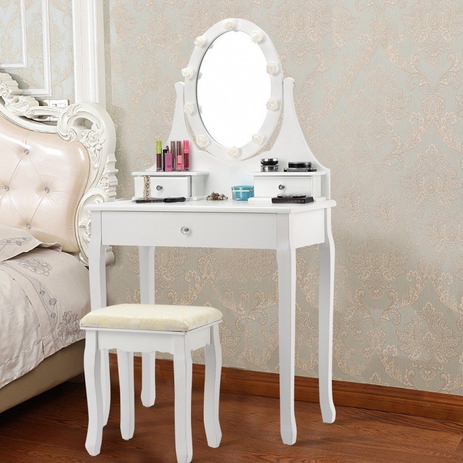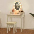 Este conjunto que consta de un tocador y un taburete acolchado también convence por su alta funcionalidad. Los accesorios de montaje incluidos facilitan la instalación. Las encimeras grandes y los 3 cajones también ofrecen la comodidad del maquillaje. Atributo: Taburete+espejo - Tocador con taburete y espejo convence por su alta funcionalidad.Taburete tapizado te hace más cómodo.Espejo giratorio de 360 °hace que sea fácil para usted crear el maquillaje perfecto Luz de maquillaje - Tocador de maquillaje con 10 bombillas producen una luz suave agradable para sus ojos cuando se aplica maquillaje. El interruptor de la luz se encuentra en la parte posterior del espejo. Práctico - Tocador con tres cajones ofrecen un amplio espacio de almacenamiento para joyas cosméticos y productos para el cuidado de la piel. Material de alta calidad - El tocador está hecho de madera resistente y estable lo que garantiza una larga vida útil. Fácil de limpiar se puede limpiar con un paño húmedo. Fácil de montar - Gracia la instrucción de montaje suministradas facilitan la instalación. Características: Espejo giratorio de 360 grados Taburete con cómodo acolchado Con 3 cajones más espacio para tus cosméticos. 10 bombillas Iluminación natural para un maquillaje perfecto. Duradero y fácil de limpiar se puede limpiar con un paño húmedo