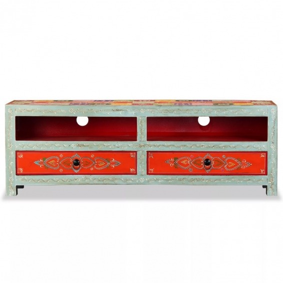 Este mueble para el televisor único agregará un toque de color y será un llamativo aporte a su sala de estar o dormitorio. Con su llamativo diseño, este soporte de TV pintado a mano será un verdadero tema de conversación cuando invite a su invitados. El mueble para la TV está hecho de madera de mango que es maciza, estable, duradera y bonita. Su artesanía se suma a su espectacular estilo retro. El mueble para aparatos HiFi presenta detalles decorativos ricos pintados a mano que destilan un toque de elegancia y resaltan el aspecto refinado. Los prácticos tiradores hacen que sea más fácil abrir los cajones y agregar al estilo distintivo del gabinete. El soporte para TV tiene 1 compartimento y 2 cajones, y proporciona un amplio espacio para mantener ordenadamente organizado su reproductor de DVD, consola de juegos, dispositivo de transmisión y soportes multimedia. Gracias a las ranuras de la parte posterior, puede ocultar los cables de alimentación detrás del armario para mantenerlos fuera de la vista. La parte superior de colores es ideal para mantener su televisor o mostrar elementos decorativos. El soporte de TV también se puede usar como armario lateral, tablero bajo, aparador, etc. Nota: El artículo se entrega totalmente montado.