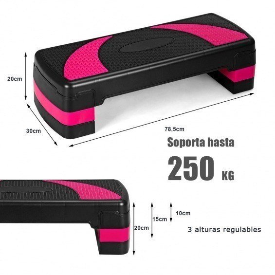 ¿Quieres entrenar fácilmente en casa? Nuestro step puede ayudarte a reforzar los músculos a aumentar la intensidad del entrenamiento a perder peos y a quemar más calorías. La superficie antideslizante tiene un agarre solido para entrenar con seguridad. Con los pies antideslizantes aumenta la estabilidad y la seguridad y protege el suelo de los rasguños. Se puede regular en 3 niveles de altura según necesidad. Ligero y compacto es fácil de transportar y almacenar y es perfecto para utilizar en casa en la oficina en el gimnasio o en el exterior. ¡Cómpralo y entrena enseguida! Atributo: Diseño antideslizante y seguro: la superficie del step tiene un diseño apanalado antideslizante para un mejor agarre y para absorber los choques evitando deslizar. Además los 4 pies antideslizantes en la parte inferior garantizan la estabilidad del step y protegen el suelo de los rasguños. 3 niveles regulables en altura: con 4 tabicas se puede regular la altura del step entre 10 15 y 20 cm. De esta manera se intensifica el entrenamiento se queman más calorías y se estará más motivados para pasar a la siguiente altura. Se monta y se desmonta fácilmente haciéndote ahorrar tiempo y esfuerzos. Material estable y duradero: hecho en PP de alta calidad nuestro step es resistente al desgaste y duradero. Gracias a la estructura resistente aguanta hasta 250 kg de peso así que puedes entrenar con seguridad. Versátil: nuestro step puede ayudarte a crear resistencia a aumentar la intensidad del entrenamiento a perder peso y a mejorar la actividad cardiovascular. Se puede utilizar para ejercicios de aeróbica zancadas alternadas push up y sit up para reforzar los músculos de brazos pecho espalda y piernas. Es ideal para personas de todas las edades y con diferentes niveles de entrenamiento. Fácil de transportar y almacenar: siendo compacto y ligero es fácil de trasportar para entrenar en casa pero también en la oficina o en el gimnasio. Las tabocas se pueden poner debajo del step que se podrá almacenar cómodamente en un rincón de la habitación. Características: Superficie antideslizante con diseño apanalado para aumentar el agarre y evitar deslizar 4 pies antideslizantes para aumentar la estabilidad y proteger el suelo Altura regulable en 3 niveles según necesidad Las tabicas se pueden poner debajo del step para ahorrar espacio Material duradero y estructura resistente para durar en el tiempo Ligero y compacto fácil de transportar y almacenar Ayuda a aumentar la intensidad del entrenamiento a perder peso y a mejorar la actividad cardiovascular Refuerza los músculos de pecho espalda y piernas con ejercicios de aeróbica push up sit up etc.