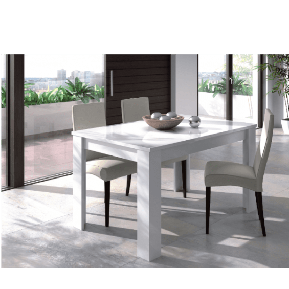 Mesa de comedor extensible. Acabado en melamina blanco brillo de 22mm y 15mm. MEDIDAS Mesa  cerrada · Ancho: 140 cm. x  Fondo 90 cm. x  Alto: 78 cm.