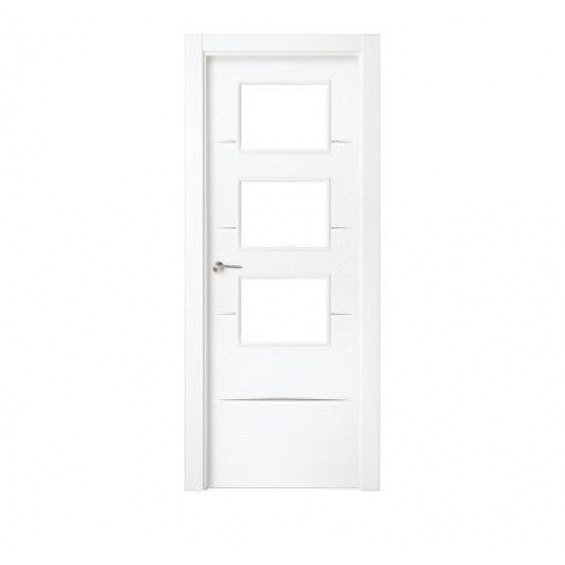Montada en block sobre premarco extensible. Hoja lacada blanca de 203 x 82,5 cm. Hoja maciza. Vidriada. Laca: 330 g/m2.
