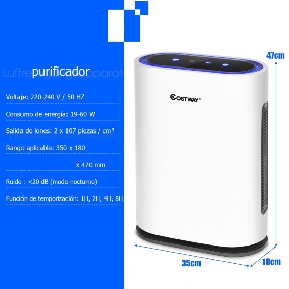 El purificador de aire es bueno para la salud de su familia. Purificador de aire es ideal contra humo, polvo, caspa de mascotas, alérgenos, formaldehído, olores extraños y especialmente polvo fino. Velocidad ajustable, función de temporización, modo de reposo y modo manual. Una variedad de funciones útiles para brindarle una mejor experiencia. Los iones negativos en el aire son ayuda a dormir. Atributo: Mejore la calidad del aire - Con una filtración de 4 etapas, el purificador de aire es ideal contra humo, polvo, caspa de mascotas, alérgenos, formaldehído, olores extraños y especialmente polvo fino. Velocidad ajustable - Los 4 niveles de velocidad se pueden ajustar según sea necesario. Gracias a su gran volumen de aire y alta velocidad de admisión, el purificador de aire puede purificar el aire más rápido. Función de temporización y modo de reposo -El purificador de aire tiene una función de temporización que se puede configurar en 1H, 2H, 4H u 8H. Hay modo de suspensión y modo manual. La configuración es muy simple y se puede configurar según sea necesario. Portátil - Con su tamaño compacto, el filtro de aire se puede usar en cualquier lugar para ahorrar espacio.Adecuado para oficina, estudio, sala de estar, dormitorio, siempre encontrará un espacio para el purificador de aire. Relajación y silencioso - Use la circulación de aire para distribuir los aceites esenciales en la habitación y reducir aún más el estrés durante el sueño. En funcionamiento, el purificador de aire funciona es tan silencioso que no afecta su sueño. Características: Mejora la calidad del aire. 4 niveles de velocidad ajustable. Filtrado eficiente de 4 etapas. Función de temporización que se puede configurar en 1H, 2H, 4H u 8H. Hay modo manual y modo de reposo. Adecuado para oficina, estudio, sala de estar, dormitorio.