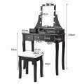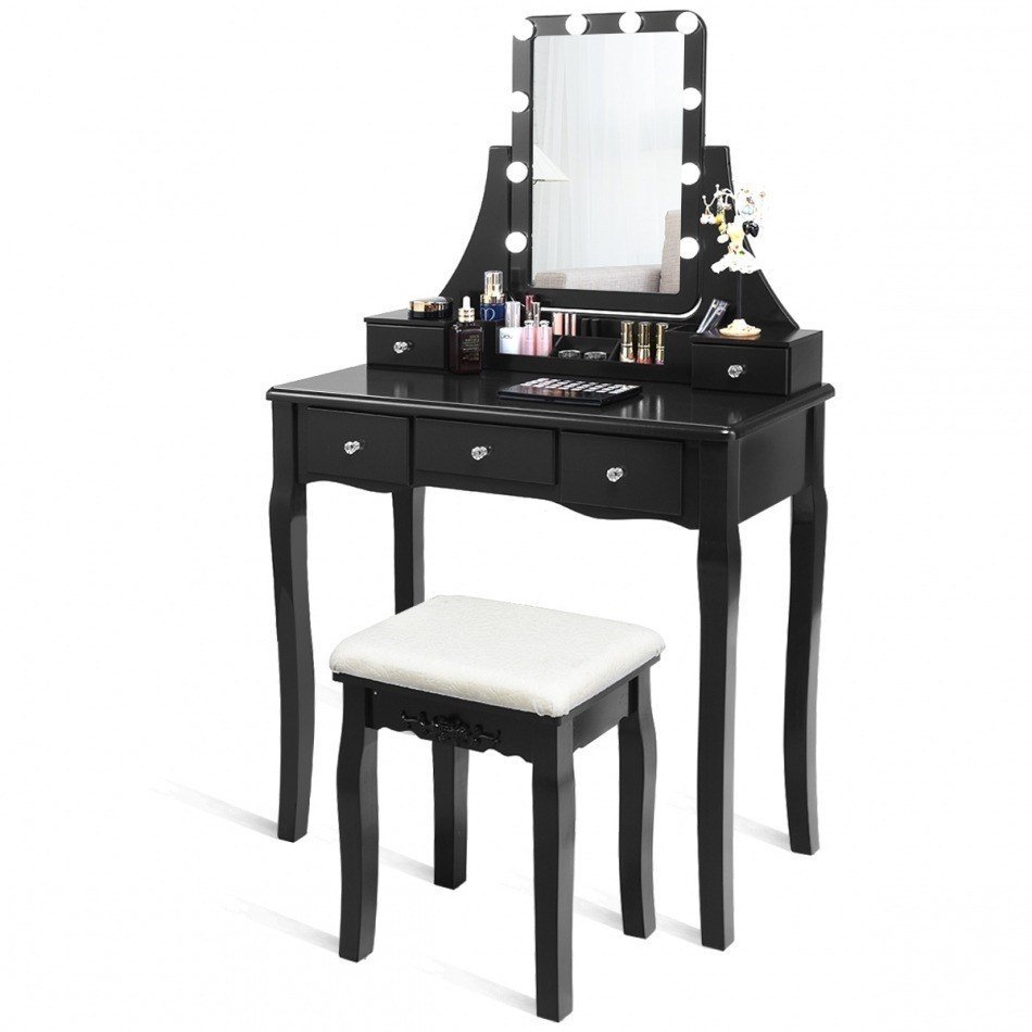 La estructura resistente y las sólidas patas de madera hacen que el tocador y el taburete tambaleen menos. Los materiales resistentes aseguran una larga duración. La luminosidad se puede ajustar y con la función memoria no tendrás que ajustarla todas las veces. El espejo rotativo a 360 grados te permite encontrar el ángulo perfecto. Los 5 cajones y los 6 compartimientos te ofrecen mucho espacio para los cosméticos y te ayudan a ordenar la habitación. El diseño elegante lo hace apto a cualquier estilo decorativo. El taburete ofrece una comodidad extra. Compra nuestro tocador y regálaselo a tus seres queridos. Atributo: Espejo rotativo a 360 grados con luces LED y luminosidad ajustable - Este tocador tiene 10 luces para ajustar la luminosidad. Una luz natural iluminará la tonalidad natural de la piel, dando calor y cómodos efectos visuales. La función memoria asegura que al encenderlas tendrás la última luminosidad ajustada. 5 cajones grandes y divisores removibles - La superficie del escritorio es espaciosa y los 5 cajones ofrecen mucho espacio para los cosméticos. Los 6 compartimientos del escritorio y los 2 divisores en el cajón del medio ayudan a clasificar tus objetos. Libérate del desorden y tendrás una casa más ordenada. Diseño 2 en 1 y regalo perfecto - El espejo se puede bajar y tener un escritorio espacioso para estudiar y trabajar. Gracias al práctico diseño 2 en 1 y al aspecto moderno, nuestro tocador es un regalo ideal para tu hija, mujer o madre para el cumpleaños, Navidad y día de la madre. Materiales de alta calidad y estructura resistente - Las patas de pino del tocador y las del taburete en madera de goma garantizan la estabilidad y la solidez del tocador. El diseño con accesorios anticaída y alfombrillas antideslizantes evita que el tocador vuelque y protege el suelo de rasguños. Taburete con cojín espeso - Este maravilloso tocador incluye un taburete tapizado. Con un tejido transpirable y apto para todos los tipos de piel y esponja de alta densidad, el taburete te sostendrá mientras te maquillas. El diseño ergonómico ofrece comodidad a las piernas cuando estás sentado. Características: MDF de alta calidad y patas sólidas de madera para asegurar estabilidad y duración 6 compartimientos y 5 cajones para amplia disponibilidad de espacio Luminosidad ajustable Función memoria Grande capacidad de peso del taburete para aguantar el peso de un adulto Diseño precioso y elegante perfecto para habitación, baño y armario Con alfombrillas antideslizantes y accesorios anticaída para utilización segura Espejo rotativo a 360 grados para una visual perfecta de cada ángulo El taburete acolchonado en esponja de alta calidad garantiza comodidad y suavidad Los cajones con pomos de cristal se abren y se cierran delicadamente