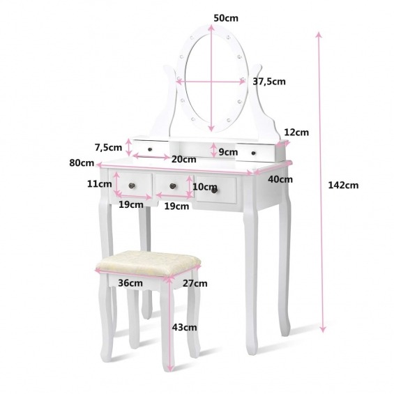 Con sus hermosas formas y su elegante color, la mesa de maquillaje es lo más destacado en su habitación. La gran mesa y los 5 cajones le brindan un cómodo espacio de almacenamiento. El conjunto de una mesa de maquillaje y un taburete acolchado convence por su alta funcionalidad. Debido a los accesorios de montaje suministrados, la estructura es muy simple. Atributo: Taburete + espejo - Tocador con taburete y espejo convence por su alta funcionalidad.Taburete tapizado te hace más cómodo.Espejo hace que sea fácil para usted crear el maquillaje perfecto. LED iluminación - Tocador de maquillaje con 12 hermosas lámparas producen una luz suave que es agradable a la vista. Te hace ver más claramente cuando te maquillas, facilitando la creación del maquillaje perfecto. El interruptor de la luz se encuentra en la parte posterior del espejo. Gran espacio de almacenamiento - El tocador de 5 cajones ofrece mucho espacio de almacenamiento para sus cosméticos, productos para el cuidado del cabello y la piel. Material de alta calidad y buena mano de obra - La mesa cosmética y el taburete de maquillaje están hechos de MDF y madera maciza, resistentes y duraderos. Debido a los accesorios de montaje suministrados, la estructura es muy simple. Espejo claro - La mesa de cosmética tiene un espejo claro y es lo más destacado en tu habitación. Características: Espejo claro Hecho de MDF y madera maciza, robusto y duradero. Taburete con cómodo acolchado Con 5 cajones, más espacio para tus cosméticos. 12 lámparas Iluminación natural para un maquillaje perfecto. Duradero y fácil de limpiar, se puede limpiar con un paño húmedo.