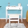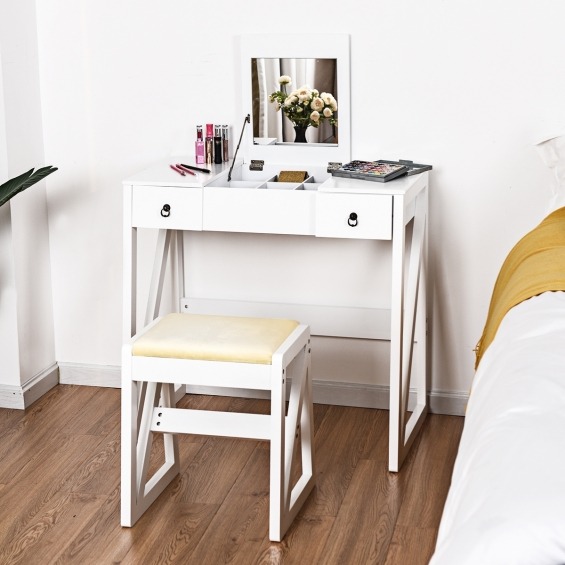 El tocador de maquillaje con taburete y espejo plegable es hermoso y práctico. Cuando usa el espejo, es una mesa de maquillaje con espacio grande de almacenamiento. 9 compartimientos proporcionan espacio y clasifican claramente sus cosméticos. En su estado normal, es un escritorio en su dormitorio. Puede guardar cosmético, joyas, pluma, reloj en los dos cajones. El taburete con esponja gruesa es suave y cómoda. Tiene mismo diseño con el tocador. Tanto el taburete como la mesa de maquillaje, son de MDF y las piernas de madera maciza. Son resistentes y estable. Atributo: 9 compartimientos - Debajo del espejo hay espacio de almacenamiento dividido en 9 compartimientos, clasifica sus cosméticos cuando se maquilla. Al mismo tiempo abre la tapa y usa el espejo plegable. Multifunción - Este tocador le sirve como una mesa de maquillaje, también es un escritorio en su habitación. La bisagra soporte el espejo fuertemente, no necesita temer por caserse automáticamente. 2 cajones - El tocador con 2 cajones le conviene guardar cosméticos, joyas y plumas. Proporciona más espacio y fácil de buscarlo que quiera. Taburete cómodo - El taburete de mismo diseño con el tocador es hermoso y estable. La esponja gruesa es suave y cómoda. Color blanco combinado con amariollo claro se adapta a muchas habitaciones. Material - El tocador de MDF es resistente y su materia es respetuosa con el medio ambiente. Las piernas de madera maciza soportan la mesa de maquillaje y taburete. Es un tocador duradero y estable. Característica: 9 compartimientos de almacenamiento 2 cajones para guardar cosas Espejo plegable Hecho de MDF y madera maciza, es estable y duradero Taburete suave y cómodo Aspecto moderno y elegante, adecuado a todas habitaciones Instala fácil con el manual