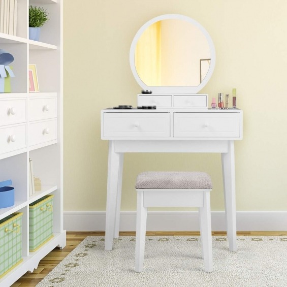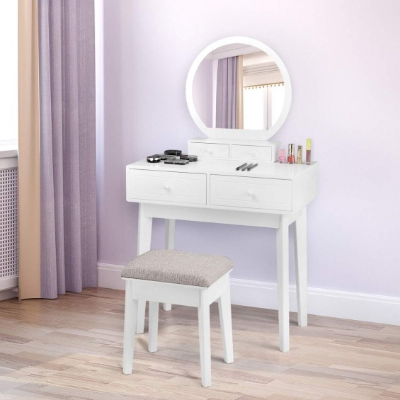 Con sus formas sencillas y su hermoso color,el tocador es un punto destacado en su dormitorio. Sin embargo, este conjunto que consta de un tocador y un taburete acolchado también convence por su alta funcionalidad. La encimera grande y los 4 cajones también te brindan la comodidad del maquillaje. Atributo: Tocador de maquillaje - El conjunto consiste en una mesa de maquillaje y un taburete. El tocador y el taburete de maquillaje están muy bien combinados. Material de alta calidad - La mesa de maquillaje y taburete están hechas de MDF resistentes. El tocador y taburete son de procesado sólido. Los accesorios de montaje incluidos facilitan la instalación. Taburete cómodo - El taburete de maquillaje acolchado le ofrece asiento cómodo. Borrar espejo - La mesa de maquillaje tiene un espejo. Fácil de usar Gran espacio de almacenamiento - El tocador ofrece mucho espacio de almacenamiento con 4 cajones. Los 4 cajones brindan mucho espacio para sus cosméticos, productos para el cuidado del cabello y la piel. Características: Precioso tocador con taburete y espejo. Taburete con acolchado cómodo Hecho de tableros de MDF de alta calidad, resistente y estable. Con 4 cajones, más espacio para tus cosméticos. Duradero y fácil de limpiar, se puede limpiar con un paño húmedo Bonito diseño, ideal para maquillaje.