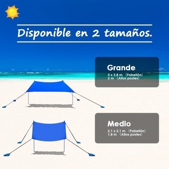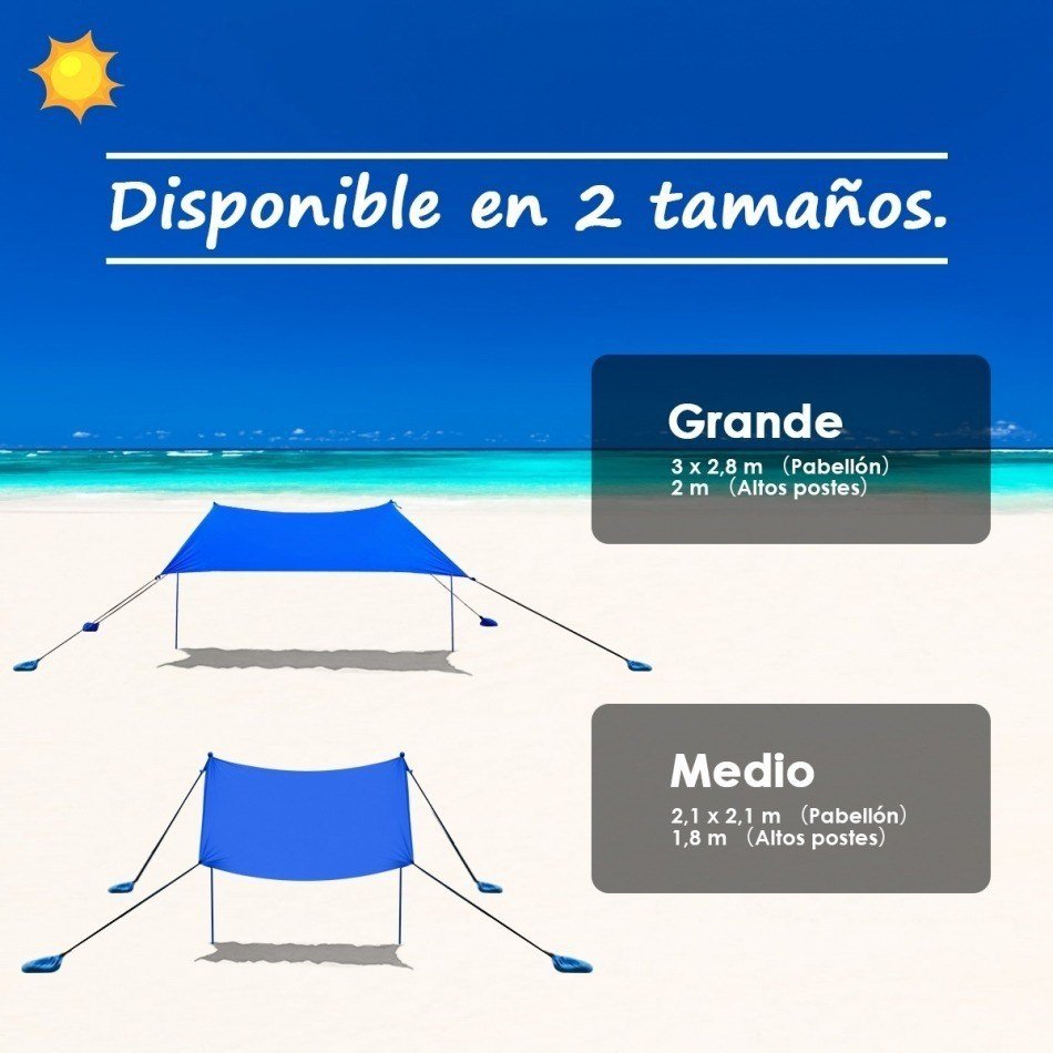 ¡Disfruta el tiempo libre protegiéndose del sol con este toldo de playa en lycra UPF 50+! Hecho en lycra con UPF 50+ te protege los rayos solares y te hace estar fresco. Se regula con los palos según el movimiento del sol para estar siempre en la sombra. Siguiendo las instrucciones se monta fácilmente y en poco tiempo. Las 4 bolsas de arena y los 4 palitos añaden estabilidad y resisten al viento. Pesa solo 2 5 kg y es fácil de trasportar con la bolsa de transporte incluida. Es ideal para camping pesca y otras actividades de exterior. Atributo: UPF 50+ y lycra de alta calidad: hecho en lycra de alta calidad con UPF 50+ este toldo para playa te protege de las quemaduras y dura en el tiempo. El diseño ancho y abrible otorga un espacio amplio para que circule el aire y para refrescarte. Palos de aluminio regulables: hecho con palos de aluminio regulables este toldo de playa se regula según los movimientos del sol durante el día para tener siempre la sombra y disfrutar del día. El diseño plegable es fácil de almacenar. Fácil de montar: con las instrucciones claras el toldo se monta rápidamente. Solo hay que extenderlo y llenar las bolsas de arena (si estás en playa) o de piedras y después fijarlo a los 2 palos de sostén con las cuerdas elásticas. Toldo de playa estable y portátil: con 4 bolas de arena y 4 palitos este toldo resiste al viento y aumenta la estabilidad. Pesa solo 2 5 kg es ligero y portátil de transportar con la bolsa de transporte incluida. Utilizable todo el año: este toldo de playa ligero y portátil es perfecto de utilizar en la playa en el parque y en el jardín. Puede hospedar hasta 2 personas juntas para relajarse después de un día de trabajo. Características: Lycra de alta calidad con UPF 50+ para protegerse del sol Te hace estar fresco gracias al diseño abierto Palos regulables según los movimientos del sol para estar siempre en la sombra Palos de aluminio plegables recubiertos en polvo antióxido Bolita en EVA en la parte superior de los palos para no arrancar el tejido 4 bolsas de arena y 4 palitos para aumentar la estabilidad Fácil y ligero de transportar con la bolsa de transporte incluida Ideal para playa parque patio jardín etc. Amplio espacio para hospedar 2 personas Fácil de montar con las instrucciones claras