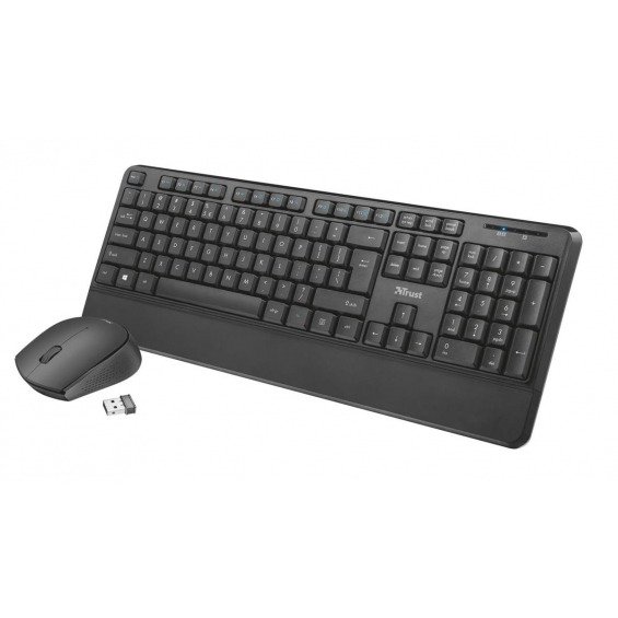 Trust 22624 Combo Teclado Inalámbrico Thoza Negro + Ratón Inalámbrico USB 1000dpi Negro. Cómodo diseño de teclado y ratón inalámbricos con 13 teclas multimedia. Características: Teclado: - Diseño de tamaño completo con teclado numérico y reposamuñecas. - Teclas de perfil bajo con pulsaciones suaves para un tecleado cómodo. - Patas plegables para cambiar el ángulo de tecleado. - 13 teclas para funciones multimedia. - Cobertura inalámbrica de 10 m. Ratón: - Ratón compacto inalámbrico apto para usuarios diestros y zurdos. - Preciso sensor óptico de 1000 ppp. - Un receptor USB de tamaño reducido, de fácil almacenamiento, para ambos dispositivos. - Cobertura inalámbrica de 10 m.