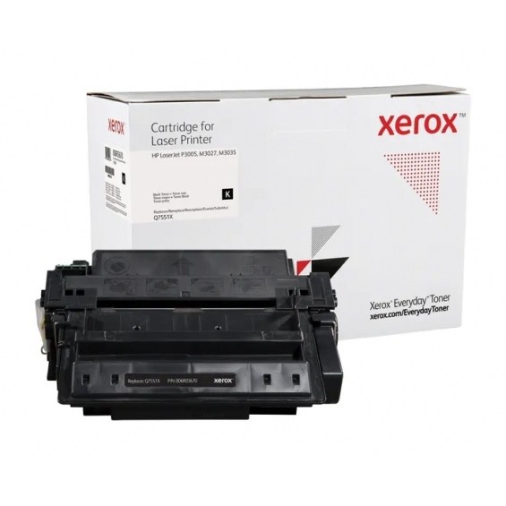 Cartucho de toner genérico Xerox Everyday para uso en HP Q7551X (51X).El tóner Xerox® Everyday? es una nueva línea de consumibles de tóner para impresoras de otros fabricantes basada en un modelo distinto: sin precios desorbitados ni costes ocultos. Tan solo la confianza de la marca Xerox y el rendimiento sólido al que está acostumbrado.Calidad. Constancia. Satisfacción:Durante toda la vida útil de su impresora, con el tóner Xerox® Everyday obtendrá sistemáticamente texto, colores y gráficos sin sorpresas ni concesiones. El motivo es que todos los cartuchos se fabrican en centros que cuentan con la certificación ISO 9001 para asegurar un rendimiento ininterrumpido. De hecho, los métodos de ensayo que recomienda el STMC aseguran impresiones de calidad de la primera a la última página y unos totales de páginas impresas que igualan o superan con fiabilidad los índices de rendimiento de cartuchos.Valor Superior. Por Mucho Menos:Confíe su tóner a quien lo conoce mejor. Obtendrá todo el rendimiento, la fiabilidad y la seguridad que espera, pero sin los costes asociados a los cartuchos de fabricantes originales.Opción respestuosa con el planeta:El interior importa: el tóner Xerox® Everyday es seguro para usted y para el medio ambiente. Las sustancias químicas de nuestro tóner y los plásticos del cartucho satisfacen o superan las normas del sector sobre el cumplimiento de los reglamentos internacionales de seguridad y protección ambiental. Publicamos el contenido de todos los cartuchos en nuestro sitio web para que tenga la certeza de que ni su salud ni el medio ambiente corren riesgo alguno.Certificaciones:Nuestros estándares de calidad, seguridad y sostenibilidad son más estrictos que los límites reglamentarios.REACH:REACH es el reglamento de la Comunidad Europea sobre sustancias y preparados químicos y su uso seguro (CE 1907/2007). Regula el registro, la evaluación, la autorización y la restricción de sustancias y preparados químicos. Su objetivo es mejorar la protección de la salud humana y el medio ambiente con una mejor identificación de las propiedades inherentes a las sustancias y los preparados químicos en las fases iniciales. REACH también tiene como fin promover la innovación y la competitividad de la industria química de la UE.Xerox ha registrado todas las sustancias químicas de las que es responsable de importar >1 tonelada al año o ha verificado el cumplimiento normativo a través de contratos de representación con cadenas de suministro.Los cilindros y los cartuchos de tóner Xerox® Everyday no contienen sustancias extremadamente preocupantes (SEP) en cantidad igual o superior al 0.1 % con respecto a la última lista de sustancias candidatas extremadamente preocupantes publicada por la ECHA para su autorización. Llevamos el seguimiento de todas las novedades que se producen en relación con este reglamento para garantizar un cumplimiento completo e ininterrumpido.ROHS:Los cilindros y los cartuchos de tóner de Xerox® Everyday que contienen componentes eléctricos y electrónicos están sujetos a la directiva europea sobre restricciones a la utilización de determinadas sustancias peligrosas en aparatos eléctricos y electrónicos (RoHS) y a los correspondientes requisitos de marcado CE y RoHS. Estos cartuchos también cumplen la normativa equivalente a RoHS en Ucrania y están etiquetados en consonancia.RAEE / WEEE:Los cilindros y los cartuchos de tóner Xerox® Everyday que contienen componentes eléctricos y electrónicos están sujetos a la directiva europea sobre residuos de aparatos eléctricos y electrónicos (RAEE) y están marcados con el símbolo de contenedor de basura tachado con un aspa para indicar al usuario final que el cartucho debe reciclarse aparte de otros residuos domésticos.ISO 9001:2015: ISO 9001:2000 es una familia de normas y directrices de calidad para los sectores de fabricación y servicios publicada por la International Organization for Standardization (ISO). ISO 9001:2015 es el nivel más exhaustivo de la serie ISO 9001:2000 y abarca todo el proceso, desde el diseño y el desarrollo hasta la producción y la distribución de productos y servicios. Su objetivo general es consolidar un sistema que mejore la calidad y la fiabilidad de los productos. Los cilindros y los cartuchos de tóner Xerox® Everyday se diseñan y producen en centros que cuentan con la certificación ISO 9001:2015.ISO 14001:2015:ISO 14001:2015 es una norma internacional, que especifica los requisitos de un sistema de gestión ambiental que permita a una organización desarrollar e implementar una política y unos objetivos que tengan en cuenta los requisitos legales y de otra índole a los que se adhiera la organización, así como información acerca de sus aspectos ambientales significativos. Es aplicable a los aspectos ambientales que la organización identifique como aquellos que puede controlar y aquellos sobre los que puede influir. Los cilindros y los cartuchos de tóner Xerox Everyday se diseñan y fabrican en centros que cuentan con la certificación ISO 14001:2015.STMCEl STMC (Standardized Test Methods Committee) es una comisión internacional creada para buscar y promover métodos de ensayo homologados para la industria de cartuchos de impresora. Los métodos de ensayo se utilizan para evaluar el rendimiento de los cartuchos de tóner. Cuando se utilizan métodos de ensayo homologados, es posible evaluar un cartucho en cualquier lugar y obtener los mismos resultados independientemente de quién realice la prueba. El STMC utiliza algunos métodos de ensayo de la ASTM (American Society for Testing and Materials), como ASTM F1856, para el rendimiento, y ASTM F 2036 para la densidad de imagen y el fondo. Los métodos de ensayo sirven únicamente para comparar un cartucho acabado con otro, normalmente de un fabricante de equipos originales. No mide los componentes. Los cilindros y los cartuchos de tóner Xerox® Everyday se prod