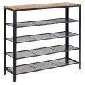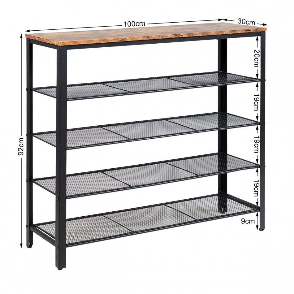 ¿Estás cansado del desorden de la entrada? Este zapatero con 5 niveles es la solución perfecta. Hecho con tubos espesos de acero y superficie de madera aguanta el peso de muchos zapatos y objetos. Los pies regulables mantienen la estabilidad incluso en suelos regulables y los protegen de los rasguños. Los 5 niveles se pueden utilizar para organizar varios artículos y el zapatero puede ser también una librería un estante o un organizador para dormitorio cocina salón o entrada. El estilo industrial añade un toque único a la habitación. ¡Cómpralo ya! Atributo: Estructura duradera y resistente: el zapatero está hecho en acero recubierto en polvo y MDF de alta calidad para garantizar resistencia y duración. Además la superficie chapada en melamina resiste al desgaste y no es fácil de rayar. Los tubos espesos de acero aumentan la capacidad de peso para aguantar zapatos y otros objetos. Zapatero con 5 niveles: el tamaño del zapatero es 100 x 30 x 92 cm y la altura entre los niveles es de 19 cm. Tiene una superficie espaciosa y 4 repisas de red de metal para poner zapatos y objetos. Cada nivel puede contener hasta 5 pares de zapatos y la altura entre un nivel y otro es cómoda para poner zapatos de todo tipo. Muy resistente: con los pies regulables el zapatero se adapta a suelos irregulares y mantiene la estabilidad y las almohadillas antideslizantes protegen el suelo de los rasguños. En la parte inferior hay espacio para poner pantuflas y sandalias y ahorrar espacio. Estilo industrial y multiuso: la combinación entre madera y metal y el estilo industrial añaden un toque elegante a la habitación. Siendo salva espacio se puede utilizar como zapatero librería estante para oficina organizador para baño dormitorio entrada salón etc. Fácil de montar y limpiar: se monta fácilmente siguiendo las instrucciones y con todos los accesorios incluidos. Las repisas amplias de red de metal evitan la caída de los zapatos y permiten el pasaje del aire. La superficie lisa de metal y la parte superior se limpian fácilmente. Características: Diseño con repisas abiertas para fácil acceso Fácil de montar con las instrucciones detalladas Estructura en hierro resistente y duradero Superficie lisa y resistente al desgaste fácil de limpiar Ideal para salón dormitorio entrada estudio etc. Pies regulables que se adaptan a suelos irregulares y mantiene la estabilidad Parte superior amplia y 4 niveles con mucho espacio Se puede utilizar como zapatero estante para oficina librería